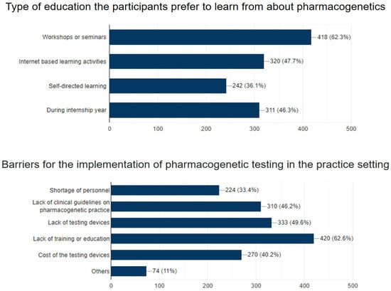 | I can accurately apply the results of a pharmacogenetic test to drug therapy selection, dosing, or monitoring | Agree Neutral Disagree | 250 (37.3%) 274 (40.9%) 146 (21.8%) |