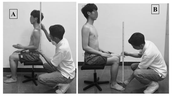 Sample picture captured during measurements. Note: (A) shoulder-elbow length; (B) knee height.