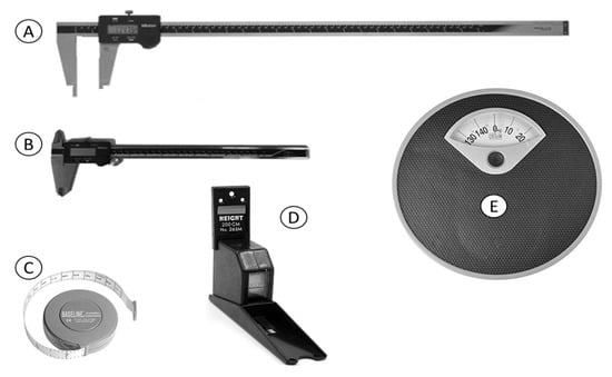 Measuring instruments used in the survey. Note: (A) larger sliding caliper; (B) small sliding caliper; (C) plastic measuring tape; (D) stadiometer and (E) weighing scale.