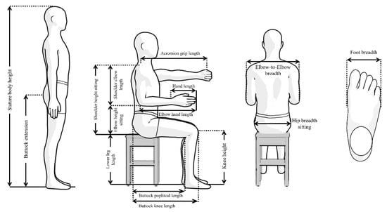 Before the measurement procedure started, the participants were informed regarding the measurement procedures and protocols for the data collection. Additionally, the participants were asked to provide their written consent for the data collection, which was prepared according to the Helsinki guidelines and approved by the committees from the four mentioned universities. The 15 measurements (see Figure 3), BMI, and body weight were carefully observed by well-trained anthropometrist, who are familiar with anthropometry and human-body landmarks for error-free and reliable measurements. Weight, stature, and buttock extension were measured in the standing position of the participants. During these measurements, the participants were asked to stand in an anatomical position on a flat floor. Similarly, the other thirteen measurements (shoulder height (sitting), shoulder-elbow length, elbow height (sitting), lower leg length, knee height, acromion-grip length, hand length, elbow-hand length, buttock-popliteal length, buttock-knee-length, elbow-to-elbow breadth, hip breadth (sitting), and foot breadth) were observed in the sitting position with adjustable stoles. During these measurements, the participants were asked to keep their torso in an erect manner (with their shoulders and head aligned with the same vertical plane), their knees together without any gaps, and their feet on the flat floor. All the measurements were recorded in the participant’s semi-nude clothing condition. Since the intra-/inter- reliability assessment anthropometry results were highly reliable, the measurements observed in the datasheet from a single trial were only for future analysis.