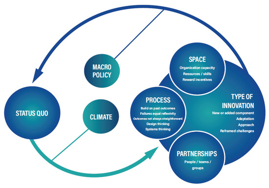 To understand how organizations create innovations, it is important to capture the context of development. Similar to a new product, process, or program, an innovation is developed within an existing condition. The degree to which innovation will be accepted or adopted is based on historical circumstances and disruption. In order to represent this context, our framework shows the “status quo.” The status quo is the prologue to innovation. It is the current state of the field, and includes both climate and macro policy [17]. In “Structure of Scientific Revolutions,” Thomas Kuhn proposes that scientific paradigms are replaced based on a staged process of emergence, normal science, crisis, and revolution [18]. The Kuhnian ideas of normal science and crisis are useful for understanding the junction at which an innovation can be introduced.