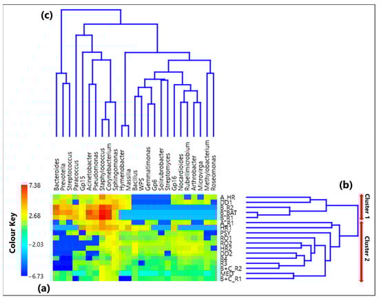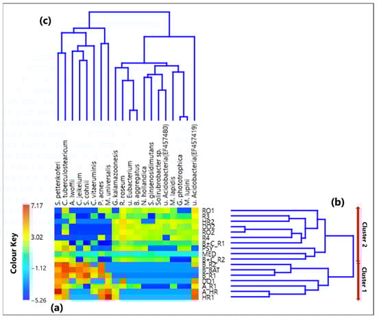(a) Heatmap based on the centered log-ratio (CLR) transformed values of the 20 selected bacterial species reads; (b,c) show the Aitchison distance-based dendrograms highlighting the relatedness between different samples and species, respectively. The two main sample clusters defined by the corresponding dendrogram are also indicated in (b). Legend: S. (Staphylococcus) pettenkoferi, C. (Corynebacterium) tuberculostearicum, A. (Acinetobacter) lwoffii, C. (Corynebacterium) jeikeium, S. (Staphylococcus) cohnii, C. (Corynebacterium) vitaeruminis, P. (Propionibacterium) acnes, M. (Methyloversatilis) universalis, G. (Gemmatirosa) kalamazoonesis, R. (Rubellimicrobium) roseum, u. (uncultured) Eubacterium, B. (Blastococcus) aggregatus, N. (Nitrolancea) hollandica, S. (Solirubrobacter) ginsenosidimutans, u. (uncultured) Acidobacteria (EF457480), M. (Modestobacter) lapidis, G. (Gemmatimonas) phototrophica, M. (Microvirga) lupini, and u. (uncultured) Acidobacteria (EF457419).