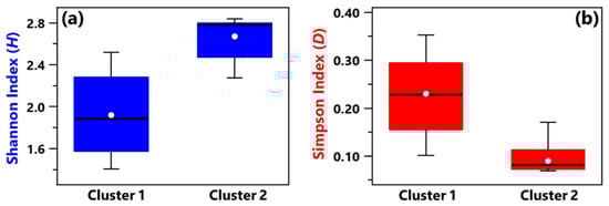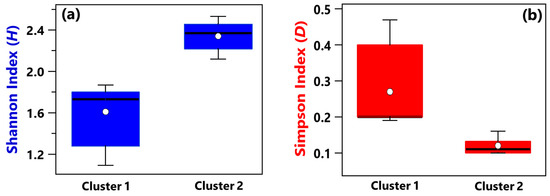 Boxplots displaying the (a) Shannon and (b) Simpson index value calculated at the genus level for the samples belonging to Cluster 1 (A_HR, DD1, B_R2, B_BAT, B_R1) and Cluster 2 (A_R1, HR1, PSY, RO1, RO2, HR2, DD2, R4, R3, B+C_R2, MED, B+C_R1). For each boxplot, the line within the box and the white dots represent the median and mean value, respectively. The bottom and top boundaries of each boxplot indicate the 25th and 75th percentiles, respectively. The whiskers are the 5th and 95th percentiles, respectively.