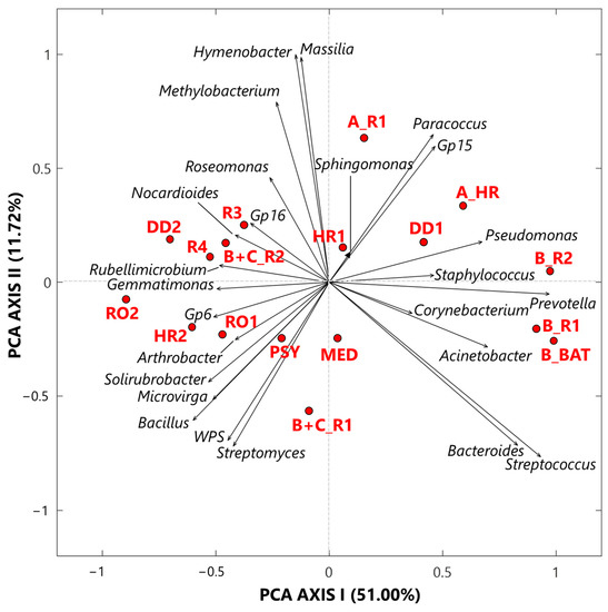 The sample MED (Figure 6) is close to the origin of the PCA axis as in Figure 3, because it was collected in an aseptic area, and consequently, it is not associated with any bacterial species. In conclusion, the SVD PCA biplot has clearly proved that the relationships among samples and bacterial species depend strongly on monitoring locations.