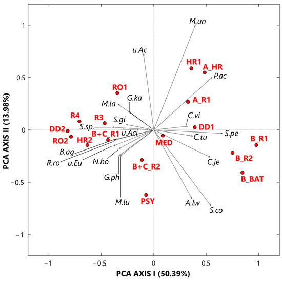 Two-dimensional SVD-PCA of the CLR-transformed values for the 20 selected bacterial species by the score (red dots) and the loading (black arrows) plot. The percentages of the total variance explained by the first and second principal components are also reported. Legend: M.un (Methyloversatilis universalis), P.ac (Propionibacterium acnes), C.vi (Corynebacterium vitaeruminis), S.pe (Staphylococcus pettenkoferi), C.tu (Corynebacterium tuberculostearicum), C.je (Corynebacterium jeikeium), S.co (Staphylococcus cohnii), A.lw (Acinetobacter lwoffii), M.lu (Microvirga lupini), G.ph (Gemmatimonas phototrophica), N.ho (Nitrolancea hollandica), u.Eu (uncultured Eubacterium), R.ro (Rubellimicrobium roseum), B.ag (Blastococcus aggregatus), u.Aci (uncultured Acidobacteria EF457480), S.sp. (Solirubrobacter sp.), S.gi (Solirubrobacter ginsenosidimutans), G.ka (Gemmatirosa kalamazoonesis), M.la (Modestobacter lapidis), and u.Ac (uncultured Acidobacteria EF457419).