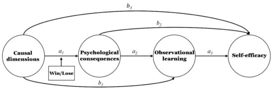 If there is no motivation to enact the model’s behavior, the behavior is latent and not shown outwardly [20]. The behavior would be enacted when a good result from this behavior is predicted. Furthermore, Bandura [1] (pp. 122–123) stated that attributions regarding success or failure affect the motivational process. Attribution theory categorizes the various causes attributed to winning or losing in the dimensions of casual locus, causal stability, and controllability [21,22], where casual locus induces pride, causal stability induces expectancy, and controllability induces shame.