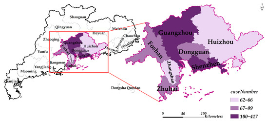 The location of seven cities in Guangdong province and their corresponding spatial distribution of the final cumulative confirmed cases during the first COVID-19 wave. For each city, the time window of the first COVID-19 wave refers to the period from 7 days before the first reported case until no new local cases for 14 consecutive days, as shown in Table 1. Additionally, the seven days considers that the epidemic in other cities has a lag of 1 to 2 weeks from Wuhan, because the infection source of other cities in the first wave was mainly imported from Wuhan [34]. The 14 days considers that the incubation period for COVID-19 generally does not exceed 14 days (http://www.gov.cn/zhengce/zhengceku/2020-02/05/content_5474791.htm) (accessed on 5 August 2022).
