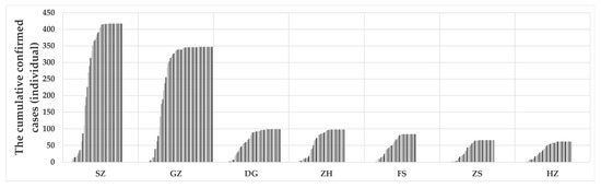 Two types of data were used in this study, including COVID-19 confirmed cases and potential influencing factors of the intervention efficiency. The COVID-19 data of the study area were obtained from the Health Commission of each local city and Guangdong province. We chose the first epidemic wave as the corresponding data time window, which refers to the period from seven days before the date when the COVID-19 case was first reported in a city until the date when there had been zero new local cases for the past 14 consecutive days, as shown in Table 1. The spatial distribution of the final cumulative confirmed cases and the daily cumulative confirmed cases of seven cities of Guangdong province are shown in Figure 1 and Figure 2, respectively. Data on potential influencing factors of the intervention efficiency include quantity and quality of medical resources, economic dynamics, and population mobility, which were obtained from the Statistical Yearbooks 2020 of the seven cities, location-based services (LBS) data obtained from open platforms, such as Amap API, and the monthly nighttime light data (https://eogdata.mines.edu/nighttime_light/monthly/v10/2020/) (accessed on 22 April 2022).