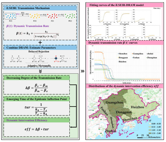 Constructing a model that can well characterize the dynamics of the epidemic transmission process is key to evaluating the efficiency of interventions. In this study, we constructed an iLSEIR-DRAM model to overcome the shortcomings of the existing models, which fail to consider the variation and stochasticity of transmission rate over time. We introduced a five-parameter logistic function to represent the dynamic transmission rate of COVID-19 and estimated the parameters using the DRAM algorithm, which belongs to the adaptive Markov Chain Monto Carlo (MCMC) method. Based on this, we further proposed an indicator to evaluate the efficiency of dynamic interventions and used it to analyze the composite intervention efficiencies of seven cities in Guangdong. The framework of the scheme is shown in Figure 3.