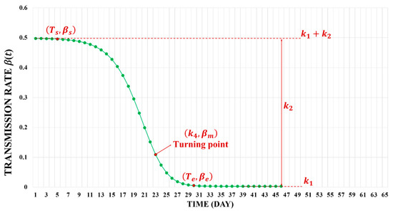 In Equations –, refers to the value of the transmission rate when the curve starts to fall rapidly (at time ). is the value of the transmission rate when the curve falls fastest (at time ). Additionally, refers to the value of the transmission rate when the curve tends to be zero (at time ). Considering the states of at these three time points and important signs of the intervention effects, this paper has constructed an indicator . The basis for obtaining and is that the first order derivative of is to be within the defined threshold (0.01 or 0.001 is sufficient). That means that between time and time , the effects of interventions cause a significant decrease in the transmission rate. This indicator was used to evaluate the dynamic intervention efficiencies of seven cities in Guangzhou. Figure 4 shows an example curve and its related parameters of dynamic transmission rate , which is useful to understand.