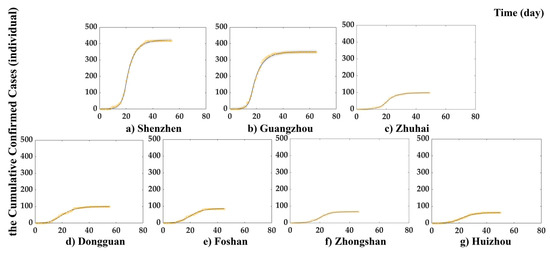 Based on times simulations under the 95% confidence level, the cumulative confirmed cases in each city fitted well with determination coefficients greater than 0.98 (Table 4). The fitting curves in Figure 5 also prove that the iLSEIR-DRAM model can simulate well in different cities. It indicates that the model with five-parameter logistic function is suitable for representing the time-varying transmission rate of the infected under human intervention.