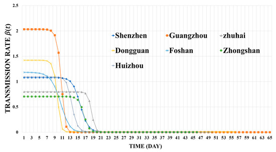 However, the differences of these transmission rate curves show distinct epidemic processes and intervention efficiencies in each city. Firstly, differences in the maximum and minimum values indicate different transmission rates at the beginning and under control, respectively. As shown in Figure 6, the initial transmission rate was highest in Guangzhou (2.03 person/day), while the lowest was in Zhongshan (0.71 person/day). After the epidemic being under control, the final transmission rates of all the cities were ultimately less than 0.01 person/day. Secondly, policies on COVID-19 might not take effect immediately after implementation due to the latency period. As reflected in the transmission rate curves, differences in the timing of inflection points indicate that it took different amounts of time for each city to bring the COVID-19 epidemic under control. For example, Shenzhen, Zhuhai, Huizhou, and Zhongshan had spent longer time to reach their inflection points. In addition, the curvature at the inflection point of the curve indicates the speed of intervention effects taken. Curvatures of the seven curves show that the epidemic turns around much faster in Foshan and Guangzhou than in the other five cities.