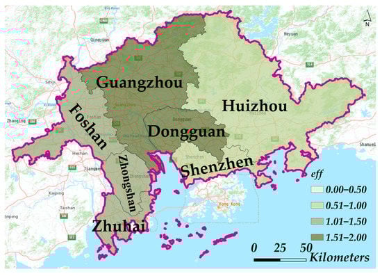 As described in Section 3.3, the construction of the indicator considers the intervention efficiency of the COVID-19 epidemic in two aspects, including both the decreasing degree of the transmission rate and the emerging time of the epidemic inflection point. Therefore, the proposed efficiency indicator in Equation is subject to both in Equation and in Equation . Based on the parameter estimation results and Equations –, the dynamic intervention efficiencies of the cities were rationally evaluated. The integrative evaluation results show that the rank of cities by efficiencies from highest to lowest is Guangzhou, Dongguan, Foshan, Zhongshan, Zhuhai, Shenzhen, and Huizhou (Table 4). Figure 7 gives the spatial distributions of the intervention efficiency in each city.