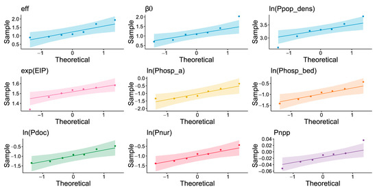 We implemented the Shapiro–Wilk (S–W) normality test to select suitable indicators and their exponential and logarithmic transformations before the correlation analysis, where the two variables involved are required to satisfy a bivariate normal distribution [48]. The results of the S–W test are shown in Table 6. According to the statistic W and P-value, we selected eight indicators , , , , , , , and to perform the Pearson correlation analysis with the . In addition, we have drawn Q-Q plots on nine variables, including , , , , , , , , and (Figure 8). In Figure 8, the distribution of these scatter points for each Q-Q plot is close to a straight line, which indicates that the original and transformed data used in this study are normally distributed.