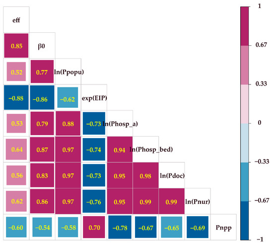 To better understand the impact of regional socio-economic vulnerability and policy response on dynamic intervention efficiencies, we chose several factors (Table 5) to explore the correlation between these variables and the efficiencies. These socio-economic indicators of the factors were selected or constructed from three aspects: (1) number of medical resources, (2) quality of medical resources, and (3) economic dynamics and population mobility. In addition, we analyzed the relationship of intervention efficiency with the epidemic inflection point and the initial transmission rate, respectively. As shown in Table 5, we first selected the initial transmission rate , the ratio of the time of epidemic turnaround (), the size of population (), medical resource-related indicators, including the totals of grade A hospitals (), hospital beds (), doctors (), and nurses (), and the growth rate of nighttime light values () as possible influencing factors, and then we analyzed the correlation between these factors and the prevention and control efficiency .