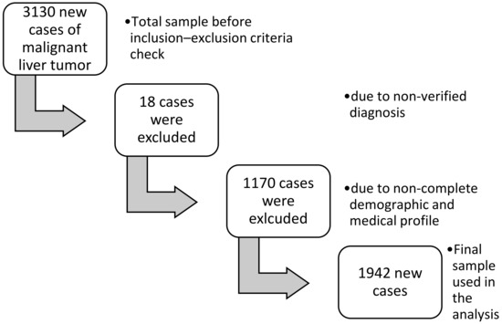 In the present study, 3130 new cases of malignant liver tumor were processed, attending the following inclusion criteria: (1) cases of primary malignant liver tumor, (2) permanent residence of Crete, for at least one decade, and (3) cases with histologic or cytologically documented diagnosis of malignant liver tumor. Cases with no information on the demographic and medical profile of patients were excluded from the present study, as well as cases with no information on the variables included in the regression model. The final number of patients included in this study was 1942 patients who met all the aforementioned criteria, while only a 4.2% of the cases did not satisfy the inclusion criteria (See Figure 1).