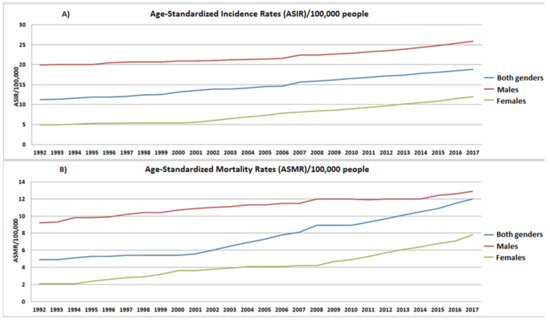 Gender-based distribution of Age-Standardized Incidence (A) and Mortality (B) Rates per 100,000 people/year for the time period of 1992–2017.