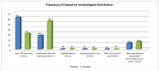 Another parameter that was studied is the frequency based on morphological diagnosis (Figure 3). Specifically, for the different types of malignant liver tumor, the incidence rate, taking into account the histological type, is the following: LCC (liver cell carcinoma): 61.1% males, 31% females; intrahepatic bile duct carcinoma: 26.4% males, 53.9% females; hepatoblastoma: 0.4% males, 0.3% females; angiosarcoma: 0.3% males, 0.2% females; other sarcomas of liver: 0.2% males, 0.4% females; other liver carcinomas: 11.6% males, 14.2% females. This distribution presented no statistical differences within the island municipalities, nor over time (p-value < 0.05).