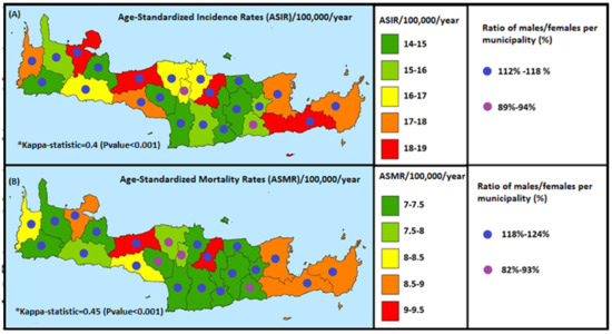 In the present study, the ASIR (age-standardized incidence rate) and the ASMR (age-standardized mortality rate) were assessed in the counties and municipalities of Crete (Figure 4A). As for ASIR in the counties of Crete, the municipalities with the highest impact were the municipalities of Heraklion, Rethymnon, Chania, and Ierapetra with ASIR 18–19/100,000/year. In the same figure, the ASMR mortality index of counties and municipalities is illustrated, which was calculated using the standardization method in order to smooth out [PK8] the differences in population structure. The kappa statistic homogeneity spatial index was used, which is equal to 0.45, and thus showed significant differences in the geographical distribution of mortality indices. It can be noticed that there is a high incidence of deaths due to malignant liver tumor in the municipalities of Heraklion and Rethymnon with ASMR of 9–9.5/100,000/year.