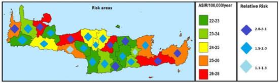 In Figure 4B, the average annual mortality as shown by the spatiotemporal analysis of data for the years 1992–2013 is distributed. The municipalities of Heraklion and Rethymnon, represented in red, appear to have the highest death rates per year. The lowest average annual mortality rates occur in 11 municipalities. The spatiotemporal trend of the distribution seems to have a clockwise development, and shifts annually in different regions. More specifically, the spatiotemporal analysis of ASMR per year shows that during the first years there were lower rates in the counties of Heraklion and Rethymnon. On the contrary, in 2013 the counties of Heraklion and Rethymnon appear to have the highest rates, followed by the counties of Chania, Kissamos, and Ag. Vasileios. No particular change is observed in the trends up until 2017.