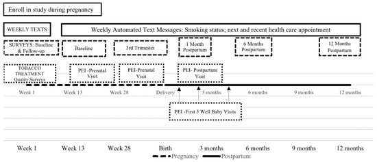 In order to improve our understanding of proximal influences on women’s peripartum smoking patterns, a prospective cohort study was conducted, Msgs4Moms, enrolling women during pregnancy and following them through 1-year postpartum. This longitudinal cohort study leveraged text messaging, a widely used, easily accessed, and low-cost communication method, as a novel approach for assessing smoking at weekly intervals. Text messages were also used to track when participants visited their health care provider and to conduct brief surveys on the quality of the tobacco treatment they received. The study also longitudinally assessed a wide range of potential variables related to tobacco use during pregnancy and the first year postpartum using five online surveys delivered at intervals throughout pregnancy and postpartum. Specifically, our surveys assessed psychological variables (e.g., depression, anxiety, coping, and stress) [24,25], financial and food insecurity, social environmental influences [24,26], substance use [16,27,28], and other relevant health behaviors. To our knowledge, the present cohort is the first study to prospectively track smoking behavior changes using weekly remote assessments of cigarette use from pregnancy to 1-year postpartum. It is also the first cohort to proximally assess the quality of tobacco treatment delivered across health care visits.