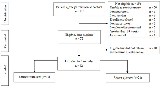 A total of 117 women completed consent to contact forms at the recruitment sites. In total, 45 (38.5%) women were not eligible to participate in the study, resulting in an eligibility rate of 61.5%. Most participants were excluded for being unable to reach or consent, for not being interested in the research, or for being a non-smoker. Among 72 eligible and consented participants, 62 completed the baseline questionnaire within 2 weeks and were enrolled in the study (see Figure 2). The cohort was comprised of 41 women who were currently smoking at baseline and 21 who were recent quitters.