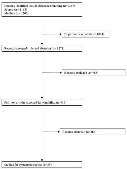 The literature search identified 2365 references. After reviewing the title and abstract, 486 articles underwent full-text review, and 23 of them were selected for inclusion [20,21,22,23,24,25,26,27,28,29,30,31,32,33,34,35,36,37,38,39,40,41,42]. The flow chart of the articles selected is represented in Figure 1.