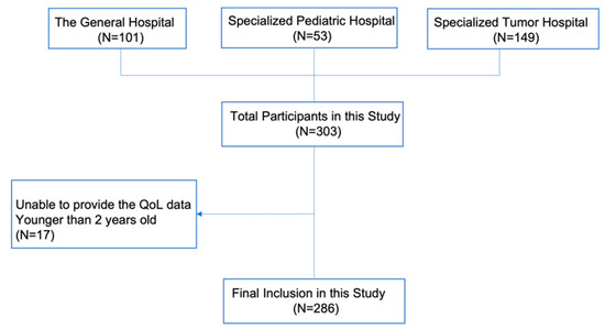 This cross-sectional study was conducted in Jinan, Shandong Province, China, from May to August 2021 [18]. Shandong Province is an important coastal province in East China. Three regional hospitals for pediatric oncology treatment were included in the sampling frame. These comprised (1) a general hospital, (2) a specialized tumor hospital, and (3) a specialized pediatric hospital. Cluster sampling was conducted to ensure the recruitment of 149 patients with solid tumors from the specialized tumor hospital, 101 patients with hematological tumors from the general hospital, and, finally, 53 hematological tumor patients from the specialized pediatric hospital. While 359 potential patient–caregiver dyads were asked to participate, the sample of respondents was composed of 303 patient–caregiver dyads who offered consent and who were able to complete all data requirements, thereby yielding a response rate of 84.4%. Seventeen children who were less than 2 years of age were excluded to elicit proxy-reported measures of the QoL of patients using the Pediatric Quality of Life Inventory Measurement Models (PedsQL 3.0 scale Cancer Module). The resulting analysis sample comprised 286 patient–caregiver dyads. A study flowchart of participant selection is shown in Figure 1. Data were collected through face-to-face interviews. Eligible caregiver respondents were interviewed by trained postgraduates. Childhood cancer patients aged 2 to 14 years comprised the study population. Family caregivers of patients were informed about the study and were asked for their consent to participate. The children required a malignant tumor diagnosis and had to be undergoing treatment for their condition during the study period. The family caregivers who refused to consent and those who consented but were unable to participate due to a serious developmental, audiovisual, or cognitive impairment were excluded.