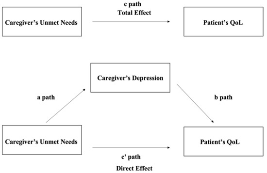 To test the potential indirect effects of depression among caregivers on the relationship between the unmet needs of caregivers and the QoL of patients, mediation analyses were performed. The relationships among the variables were examined by Pearson correlation analysis. The total effect of the unmet needs of caregivers on the patient’s QoL (c path), the association between the unmet needs of caregivers and the potential mediator variable depression among caregivers (a path), the independent effects of the mediator variable depression among caregivers (b path), and the exposure (c’ path; direct effect) of the outcome variable, the QoL of patients, were all tested through the use of multiple linear regression models (i.e., Models 2 to 4). Evidence for mediation was supported by the attenuation of the direct effect in comparison to the total effect, which was calculated as the difference between the total and direct effects (c–c’). Additionally, a 1000-sample bootstrap procedure was used to estimate the bias-corrected 95% confidence intervals (CIs) to test the significance of the indirect effect of the measured relationships. Evidence for the mediating effect was indicated when the 95% CIs of the indirect effect did not cross the zero line. All statistical tests were two-sided (p < 0.05) and were performed using Stata 15.0 (Stata Corp., College Station, TX, USA).