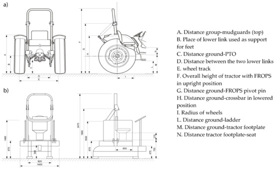 In the present study, two structures which simulated standard tractor driving station volumes were designed and built using the average dimensions recorded on tractors in previous in-field investigations [14,23] (Figure 2). The two mock-ups refer to standard tractors [5] with a rear-mounted FROPS, and their design considered the overall height and width of the tractor as well as the dimensions of other components such as the mudguard on the back wheels of the tractor and the steering wheel on the front of the tractor, which could influence the operators’ placement and behavior while performing the targeted tasks. The rear wheels’ clearances, an additional obstacle that can affect the position of the operator, were marked on the floor using white adhesive tape. and the participants were asked not to cross such lines, indicating the spatial limits to comply with during the tasks they had to perform. Micheletti Cremasco et al. [23] in their in-field study observed that the operators used the rear lower links of the rear three-point linkage [37] and the rear power take-off protection [38] as a support for their feet during FROPS handling. Therefore, to ensure that the participants would perform the targeted tasks safely, such components were built with an adequate standing surface able to accommodate at least one foot [4].