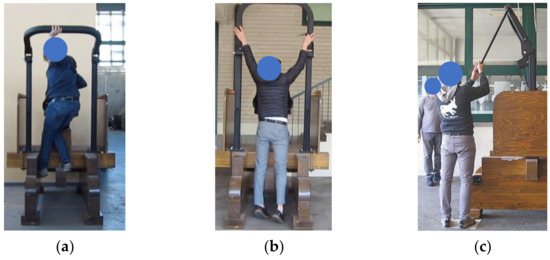 When asked to raise the conventional FROPS, most of the participants climbed on parts of the simulated tractor or had difficulty holding the FROPS firmly (Figure 5a,b). Furthermore, three participants unsuccessfully tried to raise the FROPS while maintaining their feet on the ground and then completed the task by climbing on parts of the simulated tractor. When considering the number of attempts performed to complete the required task on the conventional FROPS, 10.7% of the participants made more than one attempt while changing their hands’ grasping position or their feet placement.