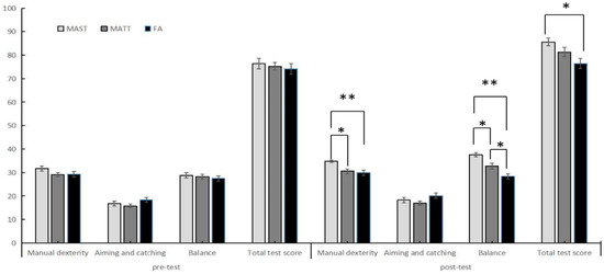 A repeated-measures ANOVA on the total motor skills scores showed significant main effects between both the pre-test and post-test results (F(1,81) = 20.41, p < 0.001, ηp2 = 0.201) and groups (F(2,81) = 3.350, p = 0.04, ηp2 = 0.076). There were no significant interaction effects between pre-test/post-test results and groups (F(2,81) = 2.353, p = 0.102, ηp2 = 0.055). Before the intervention, there was no statistical difference in the total motor skills scores among the three groups (F(2,84) = 1.045, p = 0.35), while after the intervention the total motor skills scores increased in all three groups (Table 3). Both the MAST (p < 0.001) and MATT (p = 0.026) groups had significantly higher post-test scores when compared to their respective pre-test scores; this difference was not significant for the FA (p = 0.237). Although a post hoc analysis showed that the MAST group had significantly higher scores than the FA group (p = 0.039), these differences were not significant between the MAST and MATT (p = 0.671) or MATT and FA (p = 0.573) groups (Figure 1).