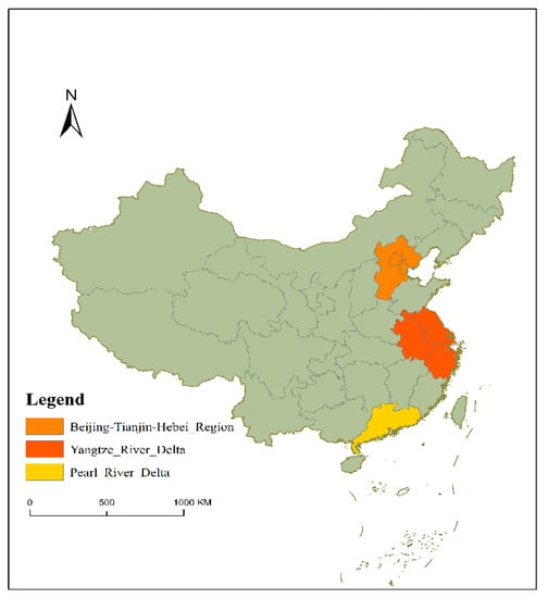 In response to China’s growing environmental and AP problems, the Chinese government has introduced measures to improve air quality and reduce AP. The State Council promulgated the Air Pollution Prevention and Control Action Plan (hereafter referred to as “APPA”) in September 2013, known as the most stringent air pollution control system in history [8]. The policy puts forward more specific goals for future AP management and sets out the implementation plan for AP prevention and control in ten areas. The Beijing–Tianjin–Hebei region, Yangtze River Delta, and Pearl River Delta are facing more serious AP problems due to the concentration of resource elements and rapid economic development [9,10,11] (Figure 1). Therefore, one of the important goals of APPA is to reduce the concentration of fine particles in the Beijing–Tianjin–Hebei region, Yangtze River Delta, and Pearl River Delta regions to improve air quality.