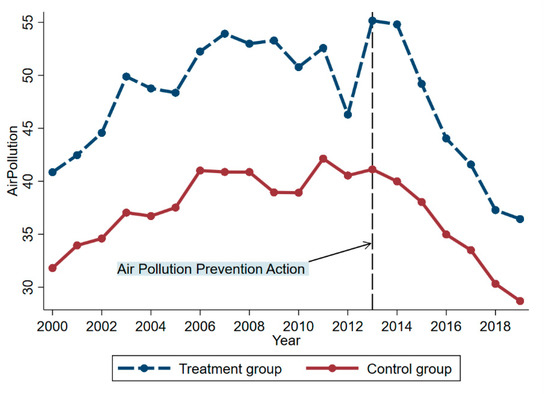 The variables are measured and sourced as shown in Table 2. PM2.5 data were obtained from the Atmospheric Composition Analysis Organization. The predictor variable data were obtained from each province’s China Statistical Yearbook and Statistical Yearbooks. For the few missing values, this study used linear interpolation to supplement them. The descriptive statistics of the variables are shown in Table 3. It can be seen that the maximum, minimum and mean values of the annual average PM2.5 concentrations of the treatment and control groups are significantly different. In addition, the mean values of annual average PM2.5 concentrations are 47.7 μg/m3 and 38.52 μg/m3, both of which did not meet the national standard of annual average concentration level 2 (35 μg/m3). In the subsequent tests, we logged the variables in order to reduce the absolute differences between the data [44].