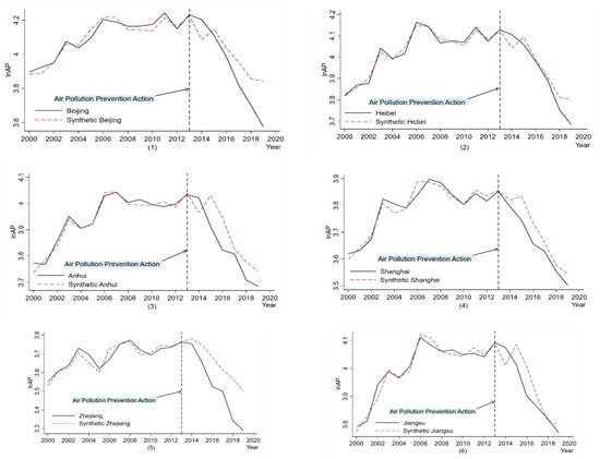 Before the implementation of APPA, the synthetic and treatment provinces generally fit well, such as Guangdong and Hebei, which showed excellent fitting trends. Beijing and Shanghai provinces still have a good overall fit, although there are individual years with fit deviations before APPA.