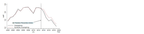 We analyze the trend of AP changes in the treatment and synthetic provinces, and Figure 3 shows the AP changes after APPA. The solid black line represents the AP level in the treatment province, the red dashed line represents the AP level in the synthetic province, and the black dashed line represents the policy implementation time, i.e., 2013.