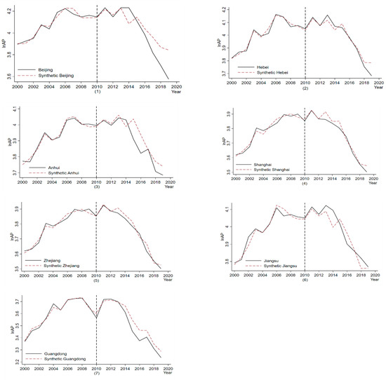 After the implementation of APPA, the AP in the treatment provinces showed a more significant decrease compared to the synthetic provinces. It indicates that the implementation of APPA did promote the reduction in AP in the treatment provinces. At the same time, we also found several interesting phenomena: (1) The policy effect in some provinces is only more effective in the early period after the policy implementation (2013–2016), and the AP decline slows down or even rebounds in the later period of the policy. For example, Guangdong’s AP levels showed a significant downward trend compared to synthetic Guangdong after the policy implementation, but the AP levels slightly rebounded in 2017. (2) The emission reduction effect of APPA on AP varies significantly among provinces. For example, while in the same Beijing–Tianjin–Hebei region, Beijing and Hebei show huge differences in emission reduction effects. Beijing shows a significant downward trend in AP levels compared to synthetic Beijing. Because Beijing’s economic, political, and cultural development is superior to that of other provinces, the implementation of the policy will receive more financial and social support than other regions to promote the implementation of the policy. However, after the implementation of the policy, the decline of AP in Hebei and synthetic Hebei did not show a significant difference. The reason may be that although Hebei is located in the Beijing–Tianjin–Hebei region, it does not have the capital city advantage of Beijing and still maintains a production model based on a traditional industrial structure. At the same time, many problems in the policy system’s top–down implementation have led to a relatively poor AP reduction in Hebei. In addition, the AP emission reduction effect in Jiangsu, Zhejiang and Shanghai (Shanghai, Zhejiang, Jiangsu and Anhui) is better than that in Beijing, Tianjin and Hebei and the Pearl River Delta region. It may be because in the Jiangsu, Zhejiang, and Shanghai regions, compared to the other two regions, industrial transformation is completed earlier, the industrial chain is more complete, and multiple entities collaborate to promote regional ecological and environmental integration AP energy saving and emission reduction.