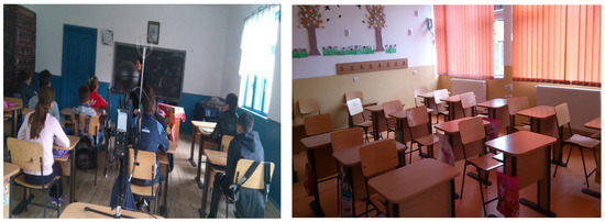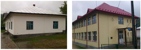 Usually, a typical urban school in Romania has 18 to 24 classrooms, 2 laboratories (biology and chemistry), 3 specific classrooms (IT, German/English lessons), 1 library, 1 sport gym, 1 professors’ room, 1 medical room and 1 counselling room. On the other hand, in Romanian rural regions the schools are much smaller with 4 to a maximum of 12 classrooms, 1 medical room, 1 professors’ room and 1 IT room. The sports activities take place outside in almost all Romanian educational facilities. Figure 1 illustrates the facades of a rural school and on the right side that of a new/renovated building. There are multiple differences in terms of heating system (stove vs. wood/gas boiler, double glazed wood pane windows vs. PVC double pane windows, interior finishings—see Figure 2 for luminaire type and number, size of the room).