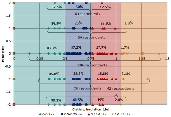 With the data gathered from the responses on thermal sensation and clothing insulation, a number of graphs were obtained which offer some interesting insights. For increased clarity, clothing insulation is divided into four main intervals covering all clothing typologies used, from summer to extreme cold apparel. A number of statements can be made at this time: the first two intervals (0–0.5; 0.5–0.75 clo) are relatively balanced (40% compared to 37%), the third one (0.75–1 clo) is slightly smaller (20%), whilst the latter interval (1–1.5 clo) is barely represented (1.8%). Nonetheless, these findings are misleading in that they do not indicate the actual number of respondents for each of the thermal comfort replies. Thus, the following figure takes the information and provides further details.