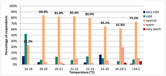 As for the rural respondents, we have a similar trend emerging. This time, the only (expected) difference comes for the 16–18 °C interval. The majority replied that it was either very cold or cold, and fewer stated that it was pleasant. For the rest of the temperature ranges, most answers correspond to the neutral sensation. Overall, it can be stated that at the time of the survey and for the temperatures recorded most respondents were pleased with the classroom temperature with an acceptance level of 82% for the temperature range 18–23 °C (see Figure 5).