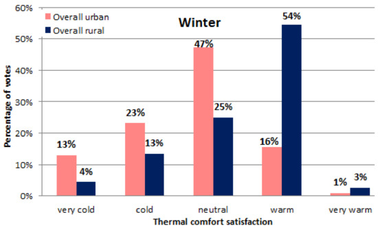 This question presented in the survey attempts to quantify the thermal perception of the respondents during the cold season. Nonetheless, since the surveys were handed out in the middle of autumn, the children had to project themselves into past winters to fill out their answers. This would theoretically induce some errors in the data collected since they are based on a recollection of past experiences which could have faded over time. Regardless of this inconvenience, the survey still manages to paint a qualitative picture of how winter impacts thermal comfort in classrooms. Moreover, our previous experience with measurements of comfort in Romanian schools during the winter season demonstrated that air temperature is found to be in the range 21–24 °C, providing almost full thermal satisfaction of the occupants. Regardless of gender, most of the urban respondents (47.2%) declared that they had a neutral thermal perception during winter, while those in countryside felt that it was warm (54.4%). The same reaction to ambient temperatures continued for the “very cold” response, with more urban respondents complaining about this than their countryside peers (see Figure 6). There could be a twofold explanation for this phenomenon. First, countryside schools could be warmer during winter due to their smaller size and the propensity to burn more wood/natural gas. Generally, in Romanian countryside schools, designated persons fire up the heating wood boiler at 6:00, two hours before the courses start. At 10:00–11:00, the burner is stopped but the thermal inertia of the buildings maintains a comfortable temperature until 13:00–14:00 when the school is closed. The high amount of wood/coal burned since 6:00 increases the indoor air temperature quickly so that from 9:00–11:00 the indoor temperatures could reach 24–25 °C. Moreover, the interior heat gains also contribute to this increase (pupils and lighting representing around 2–3 kW/classroom). A second explanation could come from countryside children being better accustomed to the cold than their colleagues from the cities. However, since the scope of the study did not cover this aspect, it remains only a supposition for now. Lastly, a third explanation would be that countryside children use warmer clothes since they expect that the ambient temperature will be low—especially during the first hours of the morning. The distances between their homes and the school are longer and the time spent on buses/walking is higher than for the students studying in the cities where a larger number schools are in their vicinity.