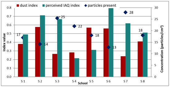 Once the particulate measurements are included in the discussion, the image sketched by the previous two indices becomes clearer. For the schools for which both indices are large (corresponding to a better IAQ), the measurements indicate the lowest particle count (14 particles/cm3 in School 2 and 13 particles/cm3 in School 6). Coincidence or not, these are also the renovated and new rural schools. For the rest of the schools which have experimental data, we observe the same positive correlation between particulate level and IAQ perception of the respondents. The higher particles’ concentration in the surrounding air, the worse the perception declared. The values presented in Figure 8 for the particle count represent the average total count particles, but on average the PM2.5 values (18.8 particles/cm3) were 10.8 times higher than the coarse ones, that is, particles having a mean diameter between 2.5 and 10 microns (1.74 particles/cm3).