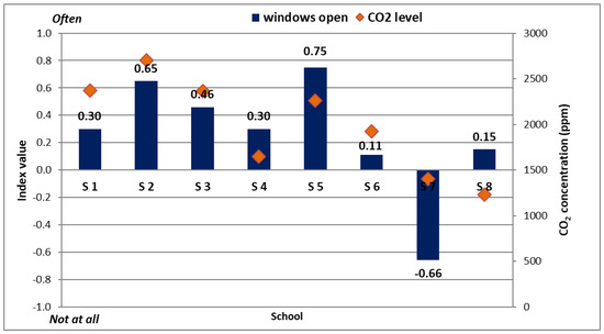 Following these observations, Figure 9 correlates the need to open the classroom windows with the CO2 concentration levels. When computing, a correlation coefficient of 0.594 is found, indicating a high likelihood of positive correlation. This means that when the CO2 concentration is high, the children instinctively feel the need to open the windows to let fresh air in and thus dilute the gas concentration. The best examples are School 5, where both index and the concentration are high, and School 7, where both index and concentration are low. Of course, these values are not perfectly positively correlated but still the values obtained are to some extent conclusive.