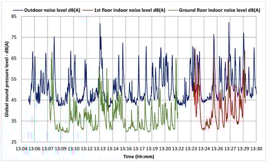 As shown in Table 10, the overall perception regardless of urban or rural environment is that the noise coming from the exterior is limited and does not interfere with the class hours. Taken together, the answers “little” and “not at all” make up 85% of all replies for the urban setting and 78% for the rural one. The marginally lower score for the rural schools comes from School 2 being situated next to a county road where heavy traffic is present daily. That is why more rural respondents (22% compared to 15%) complained about considerable noise coming from the exterior. An increased noise level is found for School 2 which was expected since the building is located next to a high-traffic county road. Furthermore, School 1 and School 5 are the best performing buildings given the acoustic comfort criterion. No other surprises are to be found. Using a class 1 sound meter, measurements were realized in order to better understand the responses; thus, it was found out that there is a clear correlation. In Figure 10 is traced the global A-weighted sound pressure level for School 2 confirming that 32% of the respondents in this school found the indoor noise level considerable. It can be observed that at some moments the outdoor sound pressure levels reach even 82 dB(A) and an average of 52 dB(A). Fortunately, the windows of the schools were replaced during the refurbishment and thus reduce the sound waves by more than 16 dB(A) from the average values. The ground floor is more exposed to the outdoor noise and the maximum permissible noise level of 40 dB(A) is surpassed by 23% in the total measurement period while for the 1st floor by 17.7%. The average values are 40.5 dB(A) for the ground floor and 36.3 dB(A) for the 1st floor.