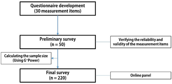 A questionnaire was developed to test this research model. An online survey with a self-administered questionnaire was conducted twice using a preliminary survey and a final survey from 8 to 15 June 2021 by one of the leading research firms in Korea. The survey targeted residents over the age of 19 who lived in apartment complexes with more than 500 households from the online panels of the research firm, using a purposive sampling method. The complexes were completed within five years in the capital region of South Korea (Seoul, Gyeonggi, and Incheon). All respondents who completed the online survey were paid KRW100 (approximately USD0.90) per min. After verifying the reliability and validity of the measurement items in the questionnaire through a preliminary survey targeting 50 people, we used 220 samples collected from the final survey for this study. In particular, we verified the reliability and validity of the measurement through exploratory factor analysis (EFA). The result of the factor loadings was greater than 0.5, and the Cronbach’s alpha coefficient values were greater than 0.7 (Figure 2).