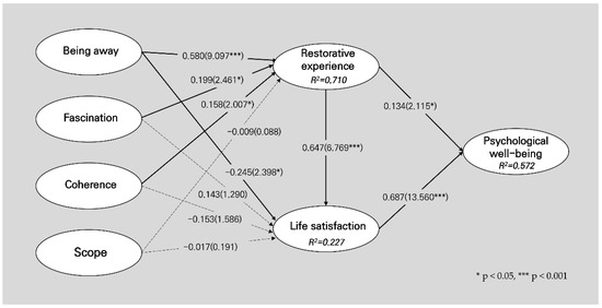 Finally, restorative experience and life satisfaction had positive effects on psychological well-being (restorative experience: β = 0.134, t = 2.115 *; life satisfaction: β = 0.687, t = 13.506 ***). Additionally, life satisfaction played a role as a partial mediator in the effect of the restorative experience on psychological well-being. In other words, the higher the residents’ life satisfaction, the higher their psychological well-being with experience in the ACLS.