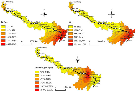 According to Figure 2, Figure 3, Figure 4 and Figure 5, before and after the opening of the China-Mongolia-Russia HSR, the accessibility improvement pattern characterized by the weighted average travel time decreasing rate and economic potential increasing rate show the imbalance differentiation characteristics of “high middle, low beginning, and low end” along the China-Mongolia-Russia economic corridor. The accessibility improvement of the cities, which are located in the middle of the lines is stronger than those cities at the beginning and end of the lines. The accessibility improvement superior areas are concentrated in the series areas of Ulan Ude-Irkutsk-Krasnoyarsk-Novosibirsk-Omsk, with their weighted average travel time decreasing rate more than the average of whole China-Mongolia-Russia economic corridor. Besides, the accessibility improvement superior areas are also distributed in the Erenhot-Zamyn Uud (border ports of China and Mongolia) and Manzhouli-Zabaykalsk (border ports of China and Russia), with their economic potential increasing rate more than 1000%.
