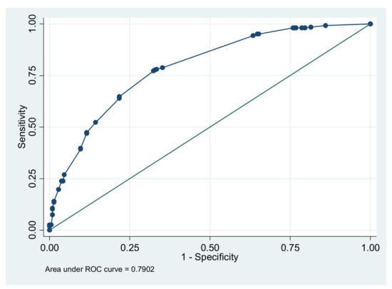 The final logistic regression model to predict the risk of SIDS is presented in Table 4. There were six significant risk factors in the final model. The factor that was associated with the highest risk of SIDS death was breastfeeding for less than two months (odds ratio [OR] = 13.85, 95% CI = 5.25–36.55, p < 0.001) compared to those who were breastfed for over four months. The other five statistically significant variables, in descending order of strength of their odds ratios, were: family history of SIDS (OR = 4.31, 95% CI = 2.24–8.31); infant birth weight of ≤1 SD below the mean (OR = 2.74, 95% CI = 1.41–5.33); exposure of the baby to passive smoking (OR = 2.64, 95% CI = 1.65–4.20); maternal anemia during pregnancy (OR = 2.07, 95% CI = 1.09–3.94); and maternal age of less than 25 years at the time of childbirth (OR = 1.77, 95% CI = 1.13–2.79). The model fit the data reasonably well in terms of discrimination (C-statistic = 0.79 [95% CI = 0.76–0.84]) (Figure 1) and calibration (Hosmer–Lemeshow goodness-of-fit test, p = 0.83).