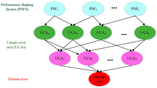 UCAs occur when human capabilities cannot satisfy system demands [9]. These unsafe acts may further lead to accidents, deaths, or injuries. Human behaviors have gained continuously more significance in the formal safety assessment (FSA) on ship accidents. The Human Factor Analysis and Classification System (HFACS) has been used to analyze maritime incidents or accidents triggered by unsafe acts [10]. Examples include general analysis [11] and specific ones, e.g., ship collisions [3], passenger vessel accidents [12,13], and unmanned vessels’ safety [14]. Nevertheless, HFACS only gives a qualitative account of human factors and remains inadequate for probabilistic risk analysis (PRA).