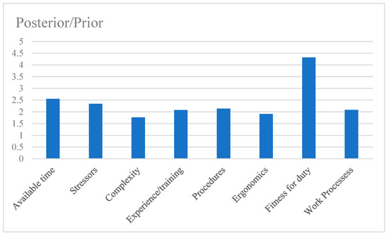 The posterior probabilities can be calculated by setting evidence in given states of the chosen nodes. For example, when the state of OOW error is set as “yes”, the posterior probabilities of all nodes can be obtained, as listed in Table 4. A bar graph is drawn with the posterior/prior value of the negative state of each PSF, which illustrates the individual contribution of each PSF to human error, as shown in Figure 6.